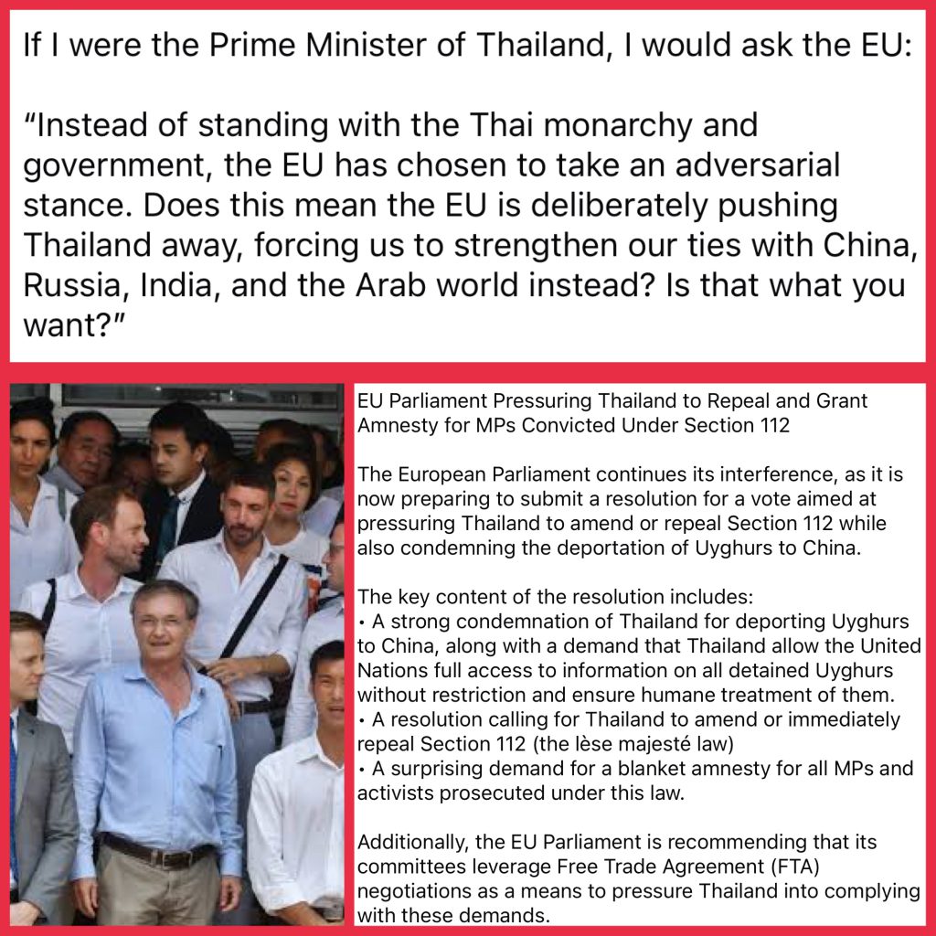 “Instead of standing with the Thai monarchy and government, the EU has chosen to take an adversarial stance. Does this indicate that the EU is deliberately pushing Thailand away, compelling us to strengthen ties with China, Russia, India, and the Arab world? Is this truly the outcome the EU desires?”