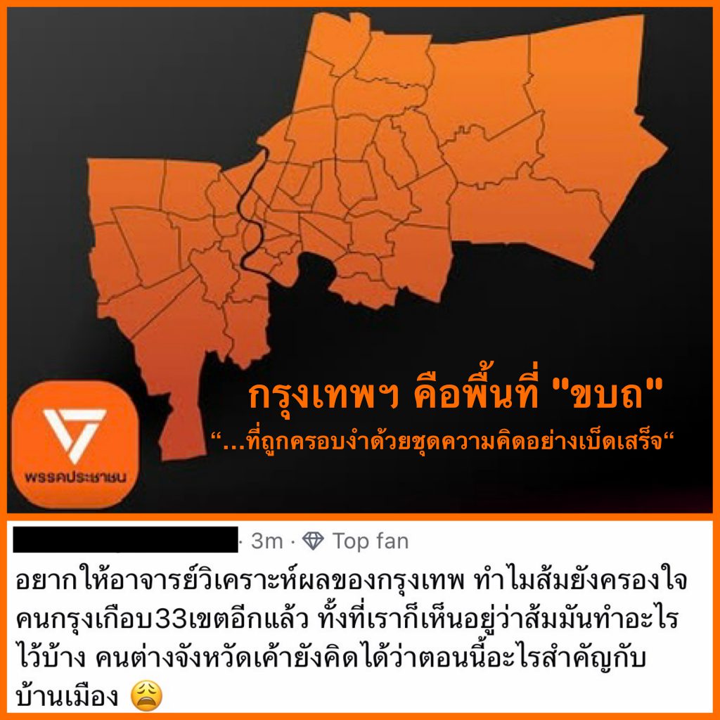 คนกรุงเทพฯ ที่ถูกครอบงำด้วยชุดความคิดอย่างเบ็ดเสร็จ รับข่าวสารผ่าน Social Media และเครือข่ายออนไลน์ที่ Algorithm มักป้อนข้อมูลที่เน้นเรื่องสิทธิเสรีภาพ ความเท่าเทียม และการตรวจสอบอำนาจรัฐ (ซึ่งเข้าทางพรรคส้ม)